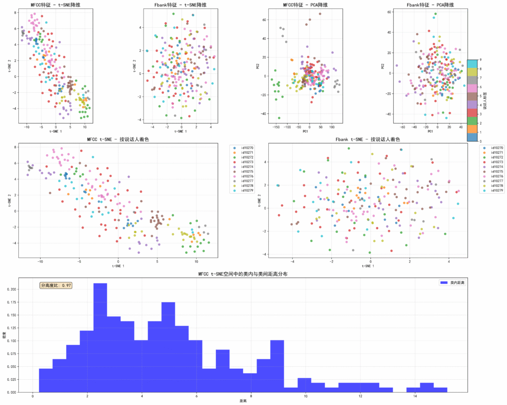 为了将高维语音特征(60 维)映射为可视化的 2D 结构,我们采用了两种经典的降维技术:PCA(主成分分析) 和 t-SNE(t-分布随机邻域嵌入)。