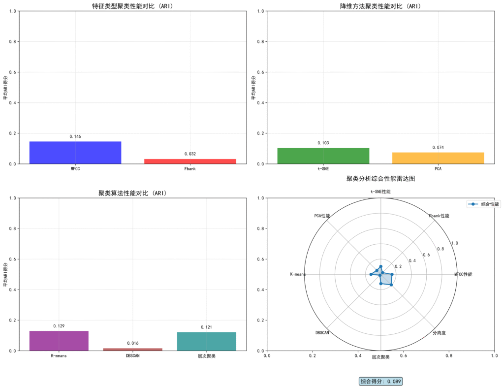 | 最佳聚类配置 | mfcc_tsne_kmeans(0.2384 ARI) |