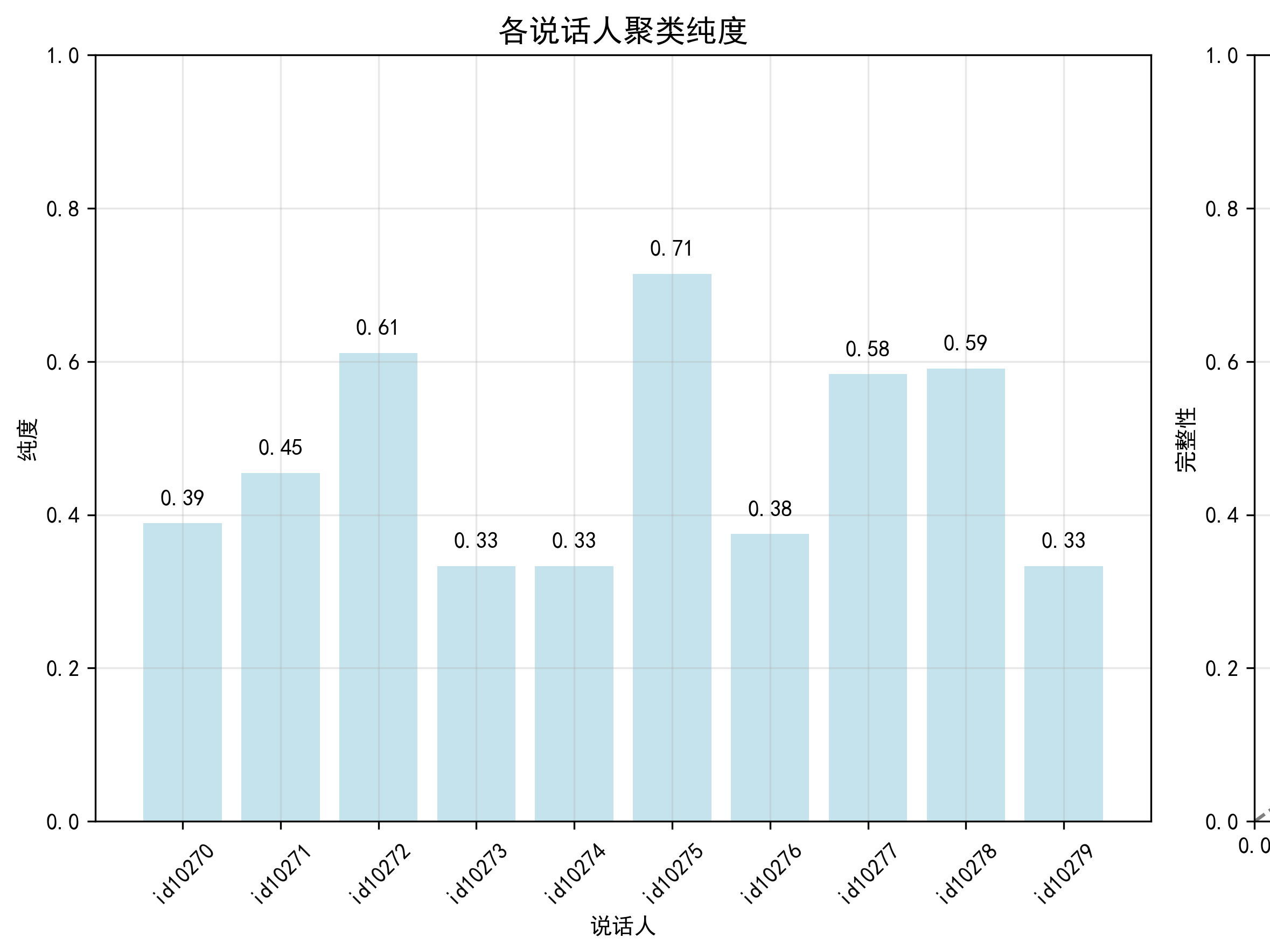 - 其纯度(Purity) 从中低(<0.3)到中高(>0.7)差异明显,反映不同说话人的语音差异程度不一,部分说话人更容易被识别。