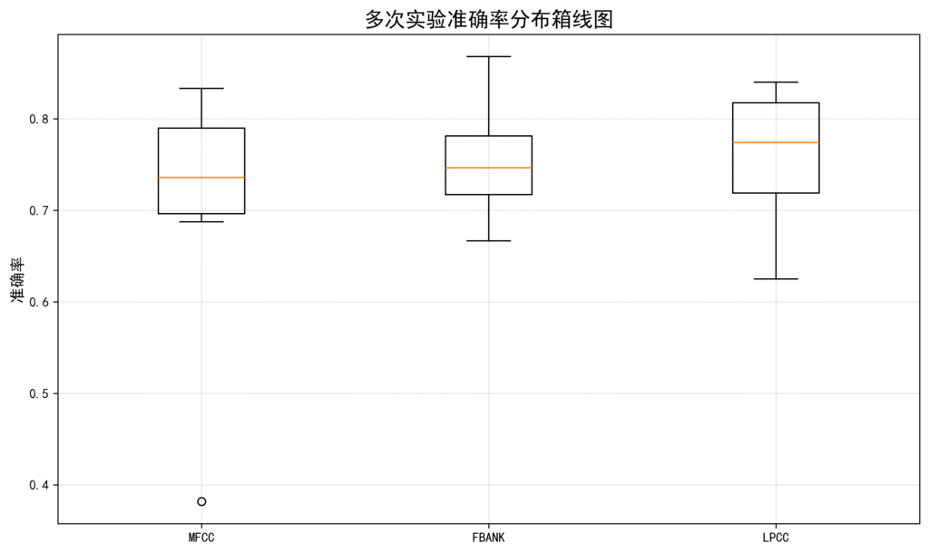 性能稳定性分析: 通过十次重复实验的标准差来看,Fbank在40说话人数据集上展现出最佳的稳定性(准确率标准差5.55%),LPCC在20说话人数据集上最为稳定(准确率标准差5.13%)。MFCC在两个数据集上都表现出较大的波动性(标准差分别达12.15%和8.94%),说明其性能受训练随机性影响较大。