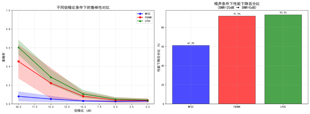 噪声下性能保持率(SNR=0dB时的性能占SNR=20dB的比例)进一步证实了这一趋势:MFCC在40说话人数据集上保持率最高(38.79%),但在实际准确率绝对值上仍远低于其他两种特征。