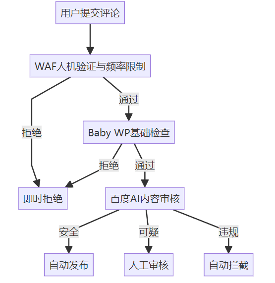 通过拒绝通过拒绝安全可疑违规用户提交评论WAF人机验证与频率限制Baby WP基础检查即时拒绝百度AI内容审核自动发布人工审核自动拦截